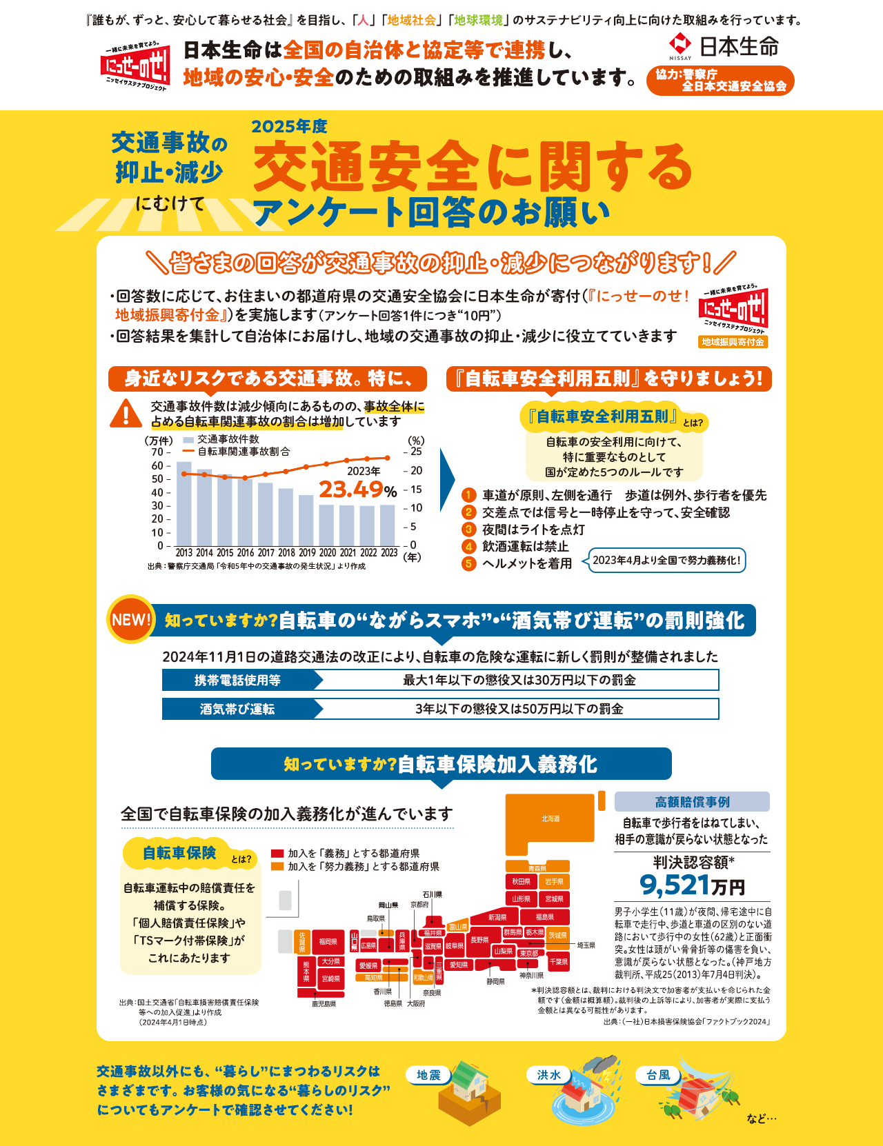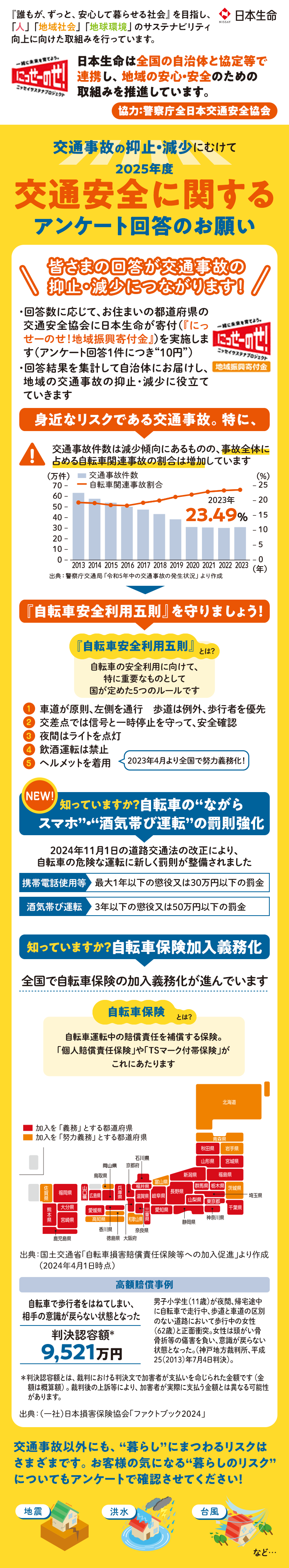 ※日本生命(以下、当社)は、ご提供いただきましたお客様の個人情報を、次の①〜④のとおり利用します。詳細については、当社ホームページの「個人情報保護方針」をご覧ください。①「当社からの、各種商品・サービス(関連会社・提携会社のものを含む)のご案内・提供」及び「当社の業務に関する情報提供・運営管理」に必要な範囲で利用します。なお、ご案内したメール・ウェブサイトやアプリの閲覧履歴等、お客様の取引履歴等の情報を分析して、各種商品・サービスのご案内・提供(広告等の配信を含む)をさせていただく場合がございます。②関連会社・提携会社である他の保険会社(以下、同社)の代理店として取扱う保険商品の提案に必要な範囲で、同社と共同利用することがあります。③取扱職員が同社と直接代理店契約を結んだ損害保険代理店である場合、取扱職員が取扱う保険商品の提案に必要な範囲で、同社と当該職員と共同で利用します。④ご提供いただきましたお客様のアンケート内容は統計資料として集計し、自治体など行政機関へ情報提供させていただく場合がございます。
